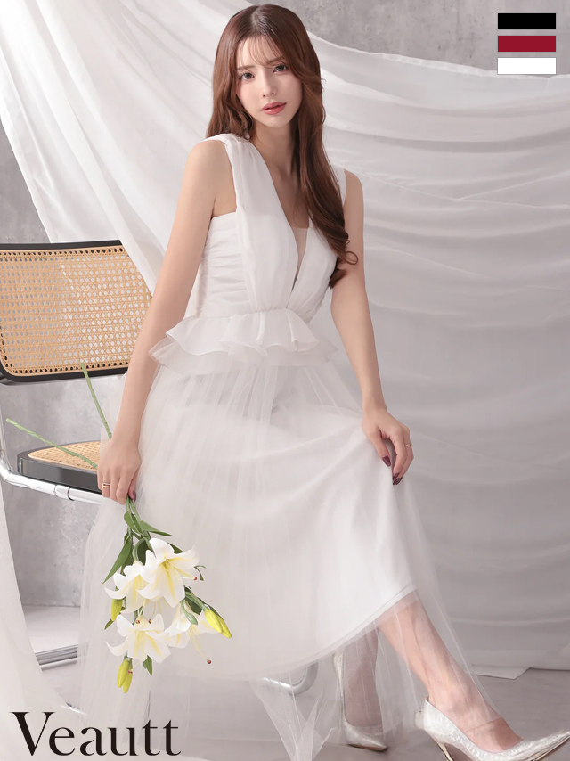 ノースリーブ ペプラム シフォン チュール ウエストフリル ドレープ Aラインロングドレス