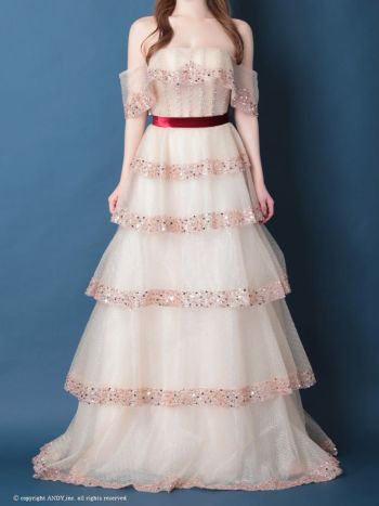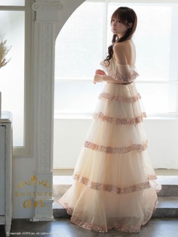 4. 【couture an/クチュール アン】オフショルダー ウエストリボン フリル スパンコール バースデー Aラインロングドレス(aocwd024)
