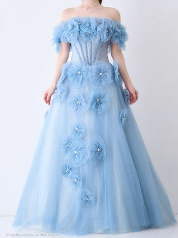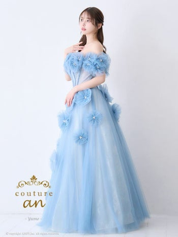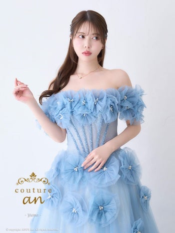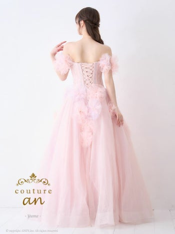3. 【couture an/クチュール アン】ガーリー オフショルダー ビジュー パール シフォン 立体 フラワー バースデー レースアップ Aラインロングドレス(aocwd028)