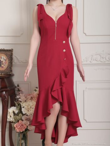 XSあり!メリハリあるボディラインを演出♪ 【an/アン】ショルダーリボン ノースリーブ ジップデザイン 裾フリル ロングテールドレス(aoc3846)