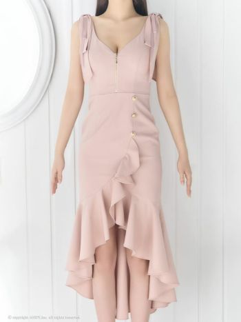 キャバドレス an セクシー ショルダーリボン ノースリーブ ジップデザイン 裾フリル ロングテールドレス