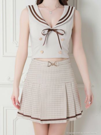 【an/アン】セーラーカラー 襟付き セットアップ ノースリーブ ギンガムチェック セットアップ Aライン フレア ミニドレス (aoc3475)