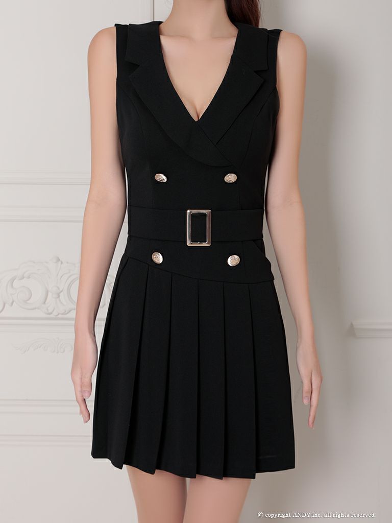 4. 【an/アン】ワンカラー 襟付き プリーツ フレア 飾りボタン 飾りベルト ノースリーブ フレアミニドレス(aoc3803)