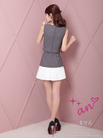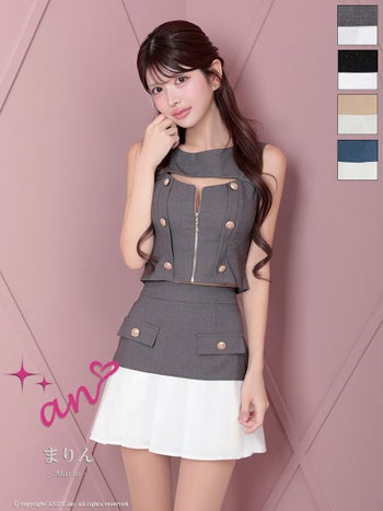4. 【an/アン】バストカット ジップデザイン ノースリーブ バイカラー ボタン プリーツ セットアップ フレアミニドレス(aoc3814)