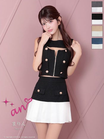 3. 【an/アン】バストカット ジップデザイン バイカラー ノースリーブ ボタン プリーツ セットアップ フレアミニドレス(aoc3814)