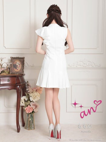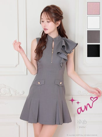 キャバドレス an ガーリー ジップデザイン ポケット ノースリーブ ショルダー フリル プリーツ フレアミニドレス