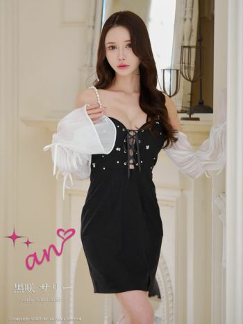 3. 【an/アン】キャミソール パール 長袖 シアースリーブ レースアップ リボン スリット タイトミニドレス(aoc3850)