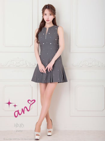 キャバドレス an アン ビジュー バックリボン ノースリーブ プリーツ ジップデザイン フレアミニドレス