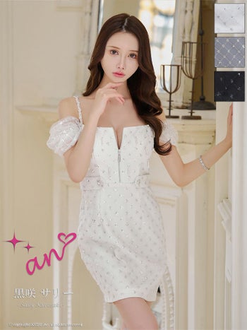 キャバドレス an アン 肩あき キャミソール ビジューチュールスリーブ フロントジップ タイトミニドレス