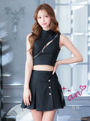 XSあり!周りと被らないデザイン☆ 【an/アン】ノースリーブ 長袖 ジップデザイン セットアップ ハイネック ワンカラー ビジューボタン プリーツ フレアミニドレス(aoc3919)