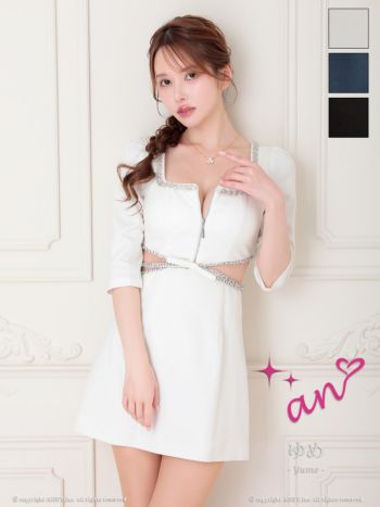 キャバドレス an アン くびれ透け スクエアネック リボン バストジップ ビジュー 袖あり フレアミニドレス