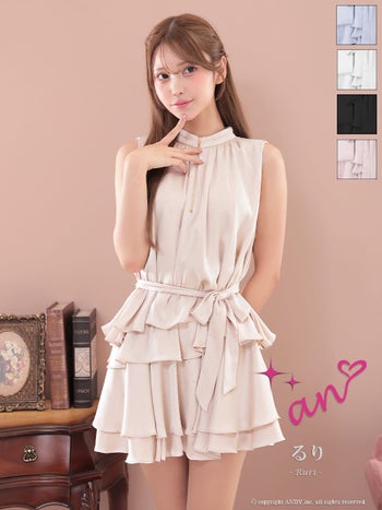 4. 【an/アン】ウエストリボン ノースリーブ セットアップ ジップデザイン フリル ビジュー フレアミニドレス(aoc3946)