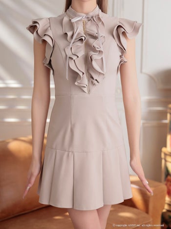 4. 【an/アン】ジップデザイン ノースリーブ フリル プリーツ リボン フレアミニドレス(aoc4058)