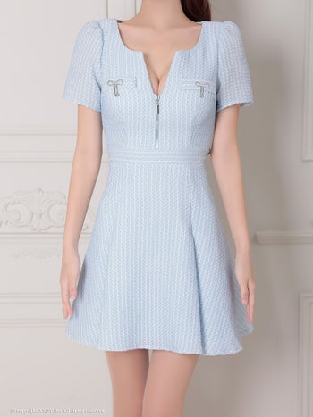 半袖 ジップデザイン ツイード カットアウト バックリボン ブローチ フレアミニドレスのメイン画像1
