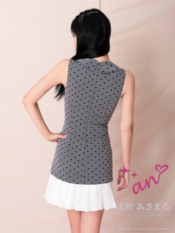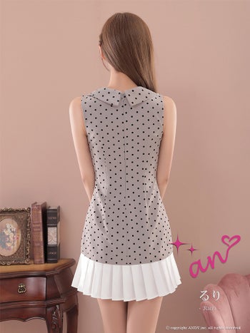 3. 【an/アン】ジップデザイン ノースリーブ ドット柄 プリーツ 襟付き Vネック フレアミニドレス(aoc4106)