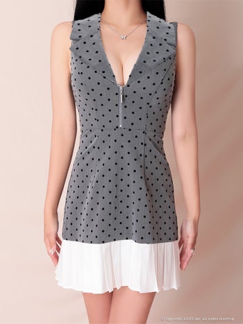 ノースリーブ ジップデザイン ドット柄 プリーツ 襟付き Vネック フレアミニドレスの詳細画像1