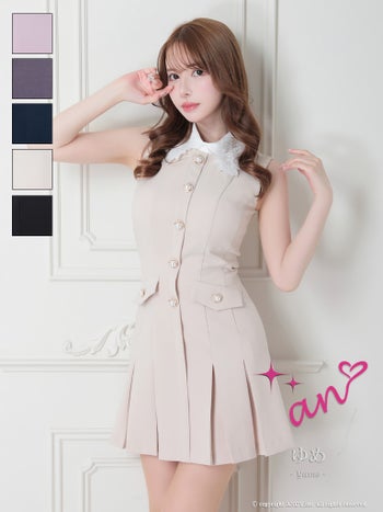 キャバドレス an レース 襟付き ノースリーブ パール ボタン ポケット プリーツ フレアミニドレス