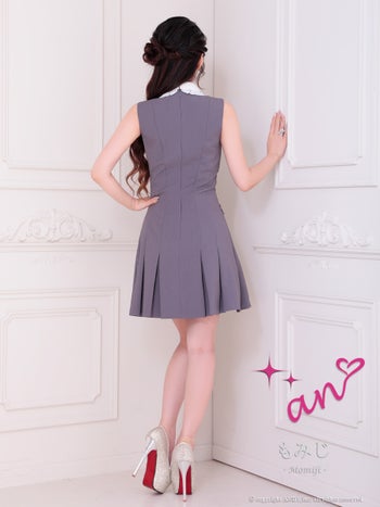 4. 【an/アン】レース 襟付き ノースリーブ パール ボタン ポケット プリーツ フレアミニドレス(aoc4109)