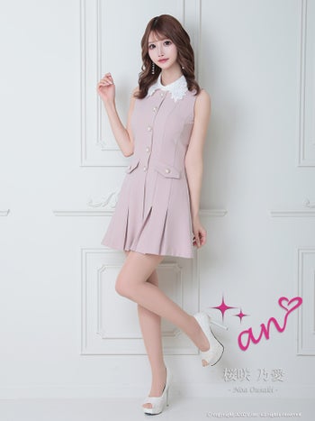 キャバドレス an レース 襟付き パール ボタン ノースリーブ ポケット プリーツ フレアミニドレス