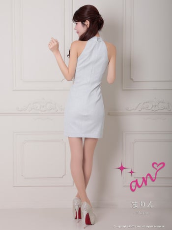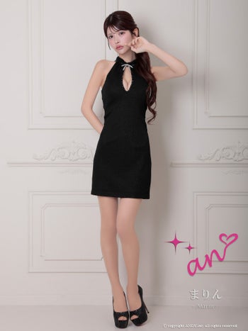 キャバドレス an アン ホルターネック ストレッチ バストカット ラメ ビーズ ワンカラー サイドカットデザイン リボンブローチ タイトミニドレス