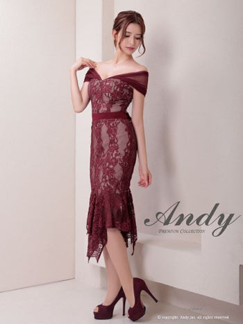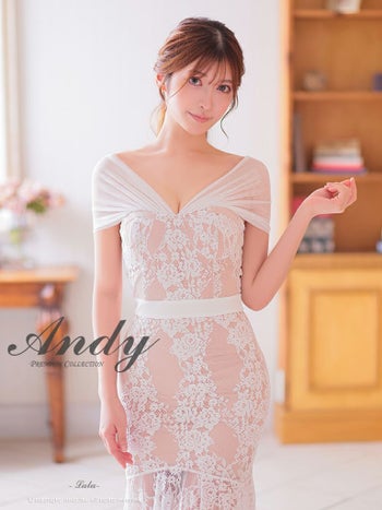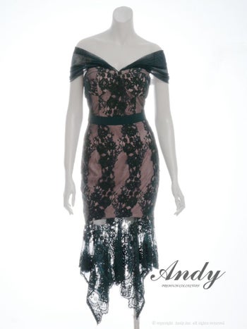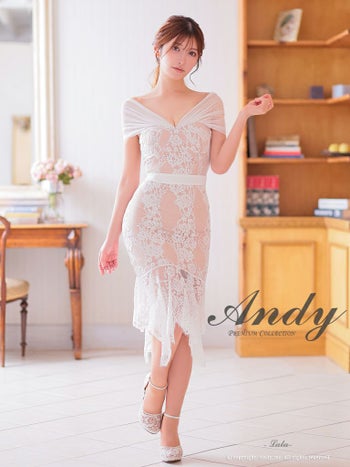 キャバドレス ミディアムドレス Andy アンディ ワンカラー フラワーレース テールカット リボン シアー マーメイド オフショルダー 膝丈ドレス