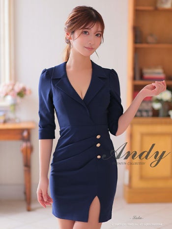 キャバドレス タイトミニドレス Andy アンディ ボタン スリット ワンカラー 襟デザイン 袖あり