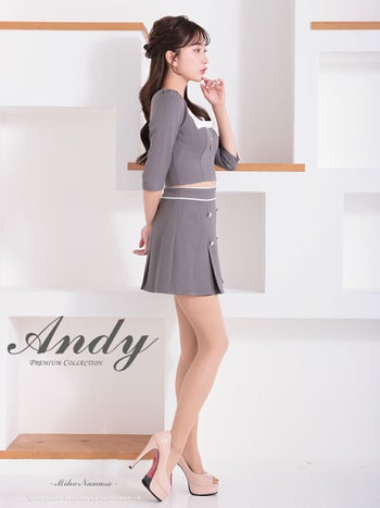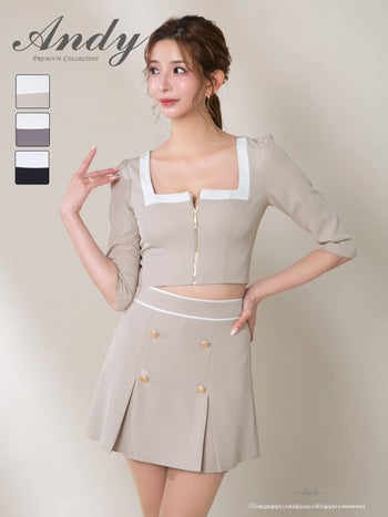 キャバドレス Andy アンディ 袖あり プリーツ ジップデザイン セットアップ 飾りボタン スクエアネック バイカラー フレアミニドレス