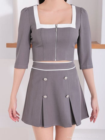 袖あり セットアップ ジップデザイン スクエアネック プリーツ フレアミニドレスの詳細画像2