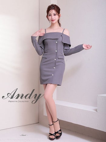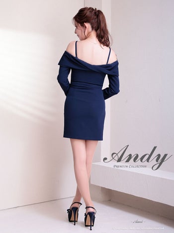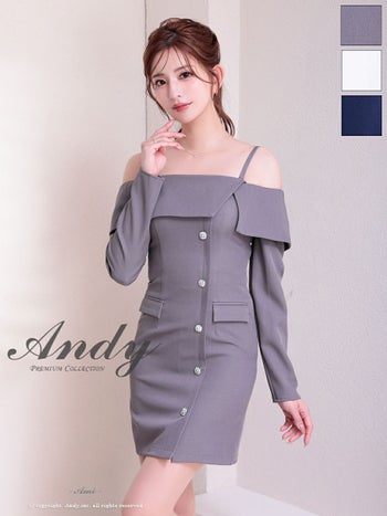 キャバドレス Andy アンディ 肩あき 長袖 飾りポケット ビジューボタン オフショル ワンカラー タイトミニドレス