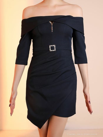 オフショルダー ジップデザイン 袖あり アシメスカート 無地 タイトミニドレスの詳細画像2