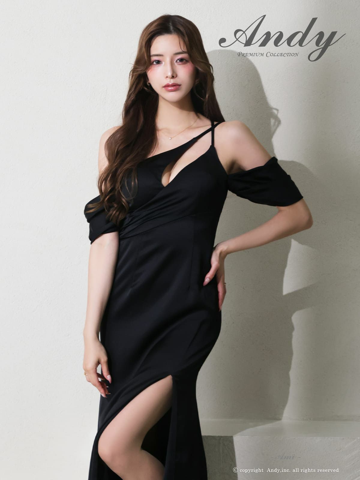 3. 【Andy/アンディ】バストカット クロスデザイン ワンショルダー タック スリット タイトロングドレス(anon2993)