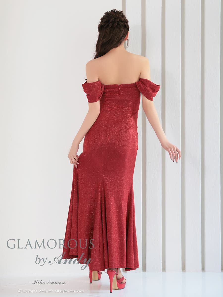 オフショルダー 半袖 ラメ スリット クロスデザイン タック ドレープ タイトロングドレスの全身バック画像3