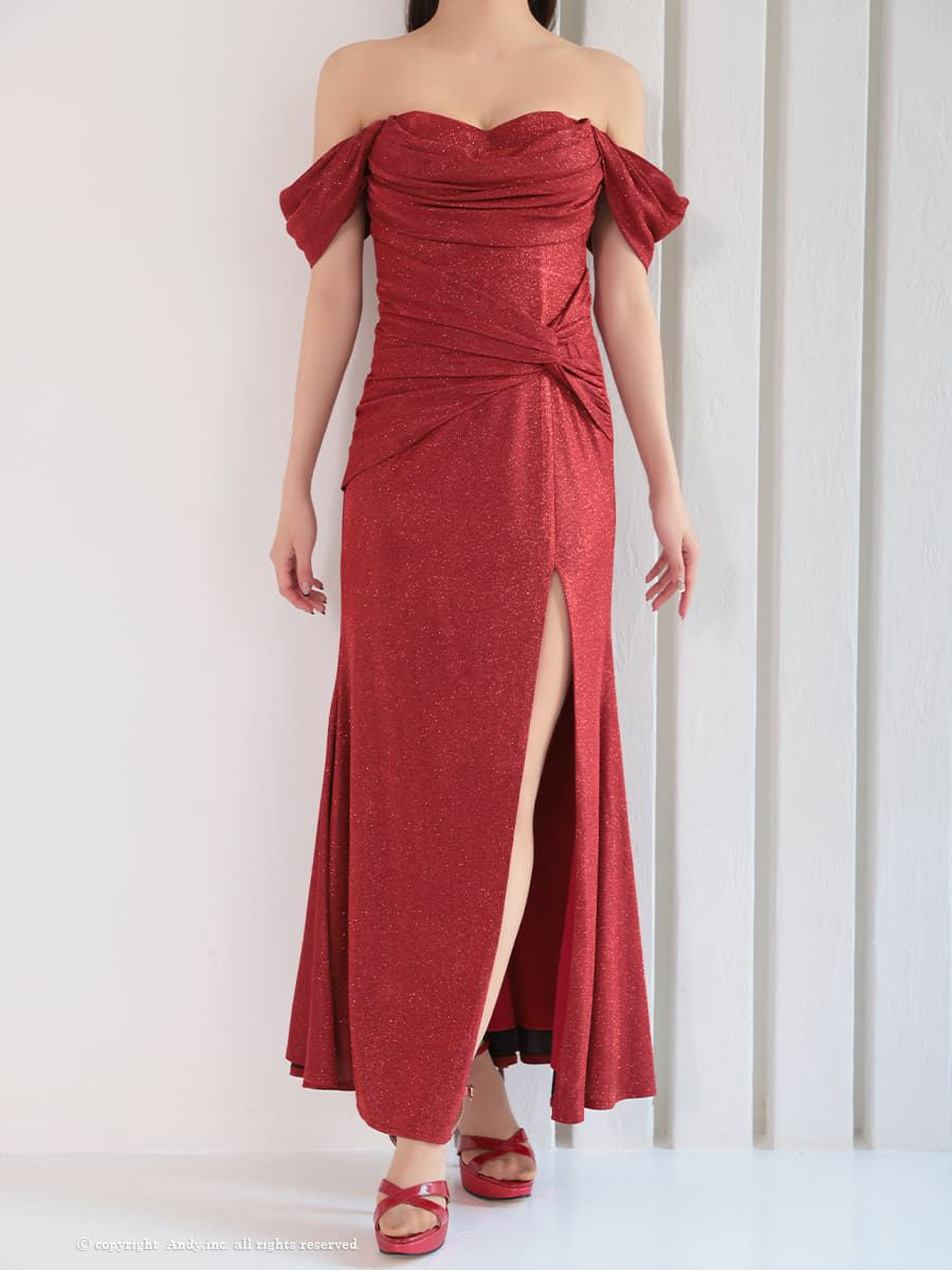 オフショルダー 半袖 ラメ スリット クロスデザイン タック ドレープ タイトロングドレスのメイン画像1