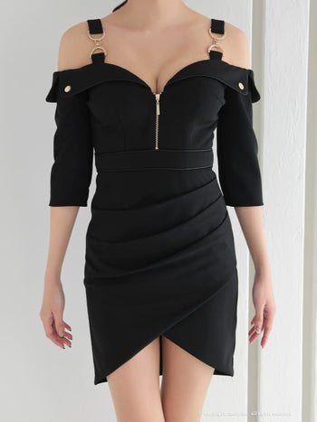 5. 【GLAMOROUS/グラマラス】袖あり 肩あき ジップデザイン チェーン 襟 タック ラップスカート タイトミニドレス(gmsv857)