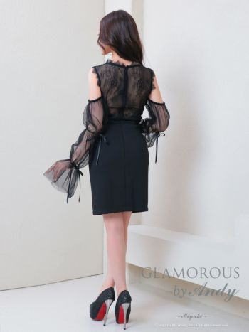 キャバドレス GLAMOROUS 2way ノースリーブ 長袖 リボン シアースリーブ バストカット ウエストカット ビジュー レース スリット タイトミニドレス