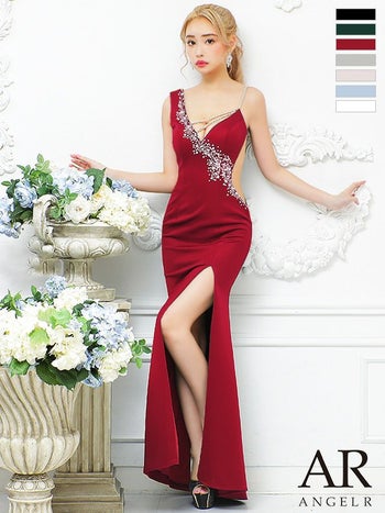 4. 【Angel R/エンジェルアール】フロント ビジューパール アシンメトリー ラインビジュー サイドスリット タイトロングドレス (AR21826)