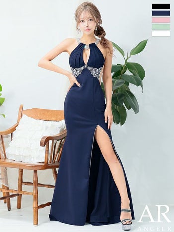 キャバドレス Angel R エンジェルアール くびれ透け ビジュー スリット セクシー バストカット ホルターネック タイトロングドレス