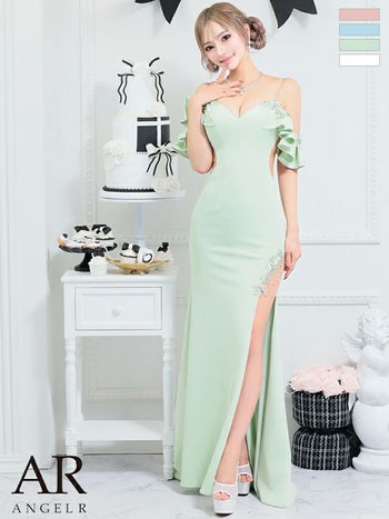 キャバドレス Angel R セクシー フリル 肩あき Vカット スリット パール フラワー刺繍 くびれ透け タイトロングドレス