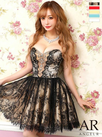 4. 【Angel R/エンジェルアール】フワフワ レース×フロント ビジュー ベアトップ フレアミニドレス(AR21313)
