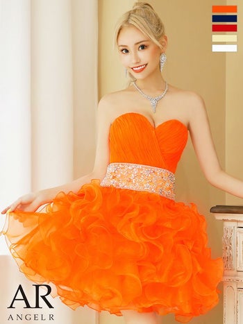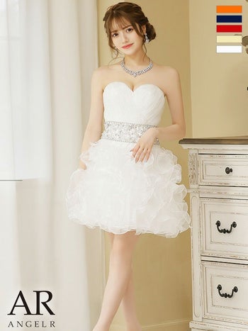 3. 【Angel R/エンジェルアール】スピンドル付き アッパーギャザー ベアトップ ボリューミー ウエストビジュー フレアミニドレス(AR22344)