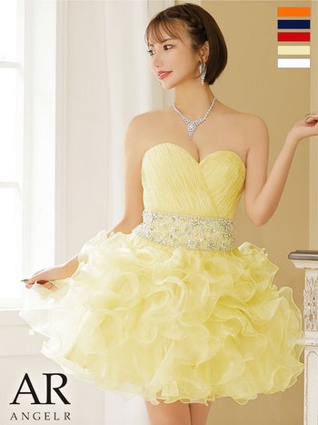 4. 【Angel R/エンジェルアール】スピンドル付き アッパーギャザー ベアトップ ボリューミー ウエストビジュー フレアミニドレス(AR22344)