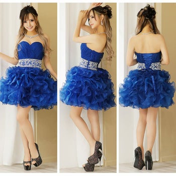 バックスタイルはスピンドル付きで調節可能♪ 【Angel R/エンジェルアール】スピンドル付き アッパーギャザー ベアトップ ボリューミー ウエストビジュー フレアミニドレス(AR22344)