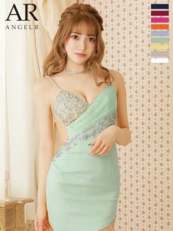 XSあり!ビジューがゴージャス感をプラス☆ 【Angel R/エンジェルアール】キャミソール バストウエスト アシンメトリータック シースルー ビジュー ワンカラー タイトミニドレス (AR22824)