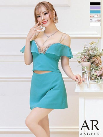 XSあり!バストラインに煌めくビジューがセクシー☆ 【Angel R/エンジェルアール】セクシー シースルーレースフリル ビジュー ショートパンツ セットアップ 肩あき オフショルダー タイトミニドレス (AR23807)