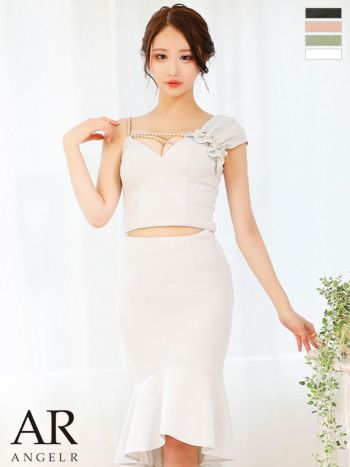 3. SALE【Angel R/エンジェルアール】ラメ素材 アシンメトリー ショルダー パールビジュー マーメイド ノースリーブ セットアップ ミディアム ひざ丈ドレス (AR24318)