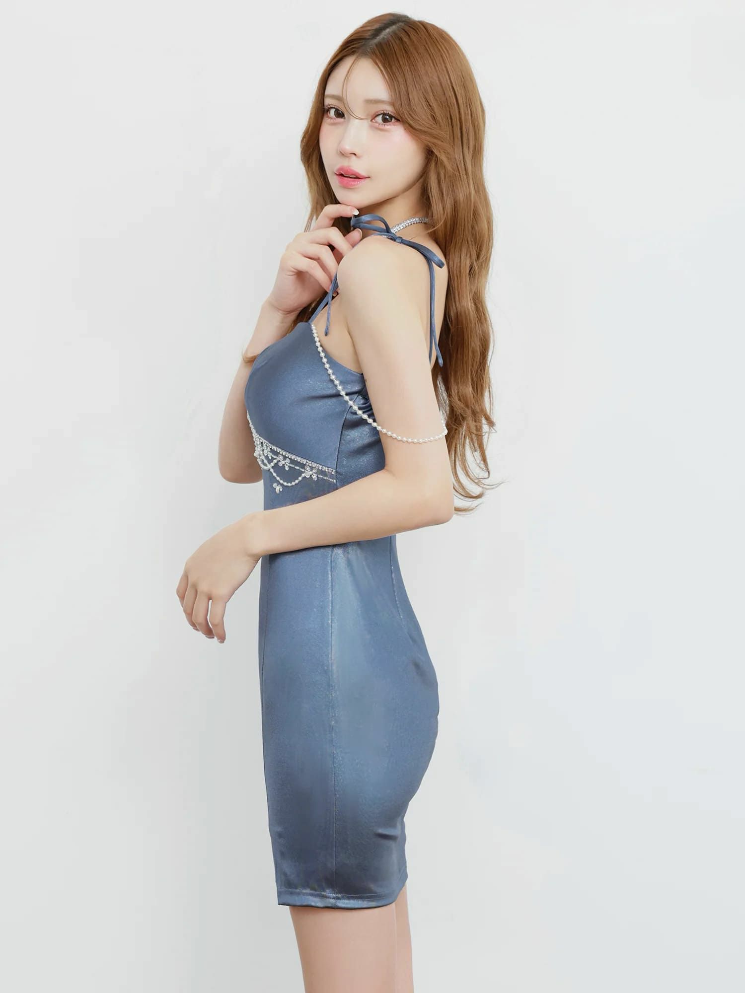 4. 【Angel R/エンジェルアール】バストカット パールチェーン ビジュー タック サテン フェミニン キャミソール ショルダーリボン タイトミニドレス (AR25251)