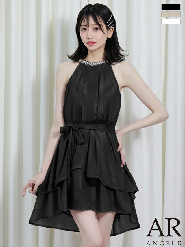 XSあり!ふんわりシフォンドレス♡ 【Angel R/エンジェルアール】ウエストベルト ビジュー シフォン パール ホルターネック フレアミニドレス (AR25832)