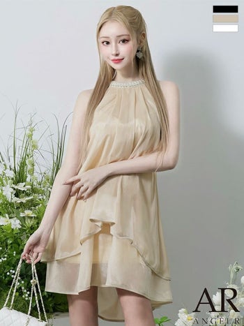 3. 【Angel R/エンジェルアール】シフォン ビジュー ホルターネック ウエストベルト パール フレアミニドレス (AR25832)