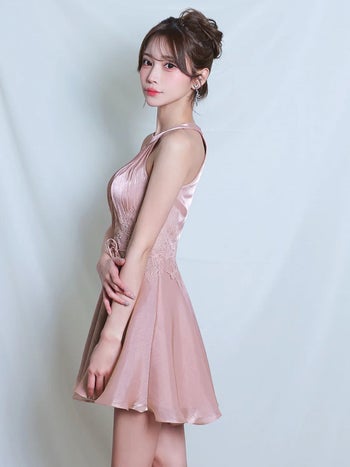 キャバドレス Angel R エンジェルアール ウエストリボン ホルターネック ギャザー 刺繍 フラワーメッシュ フレアミニドレス