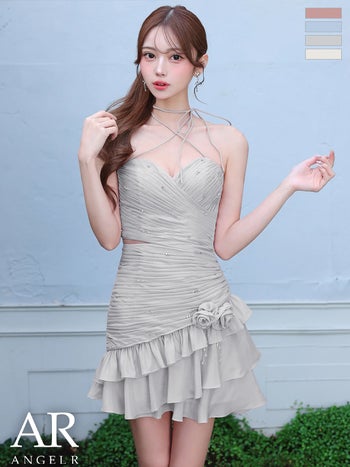 3. 予約商品【2月下旬入荷予定】【Angel R/エンジェルアール】ネックリボン クロスネック フリル フラワーモチーフ ギャザー ウエストカット フレアミニドレス (AR26310)